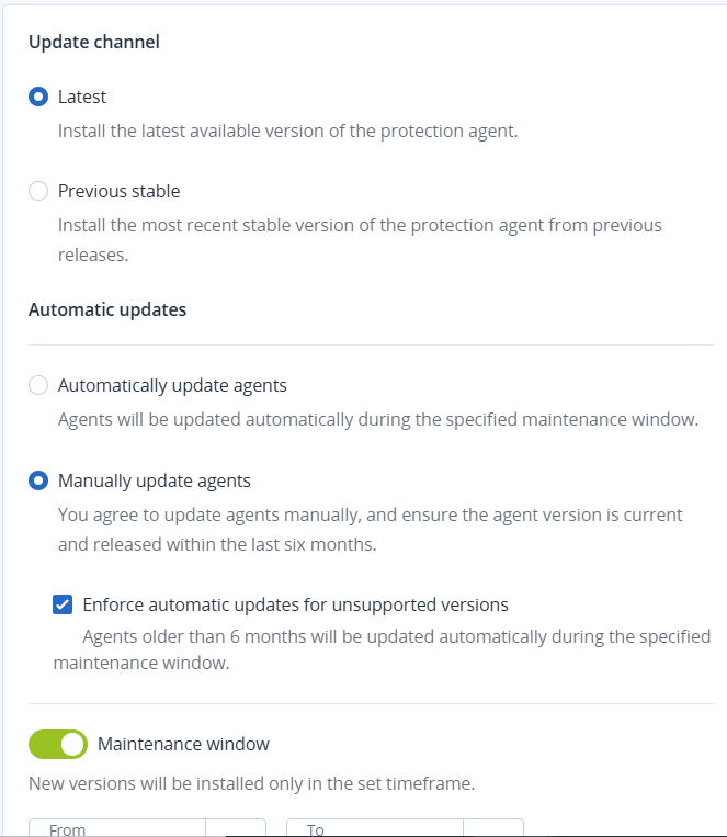To prevent security risks, ensure access to the latest features, and minimize the technical issues caused by significantly outdated agents, enable the automated updates of agents that are older than 6 months.