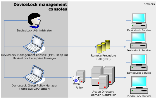 3. The management console is the control interface that systems administrators use to remotely manage each system that has DeviceLock Service. DeviceLock ships with four different management consoles: DeviceLock Management Console, DeviceLock Enterprise Manager, and DeviceLock Group Policy Manager (integrates into the Windows Group Policy Editor). DeviceLock Management Console is also used to manage DeviceLock Enterprise Server and DeviceLock Content Security Server.