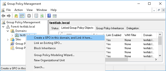 1. In the Group Policy Management console tree, right-click your domain and then select the following command from the shortcut menu: Create a GPO in this domain, and Link it here.