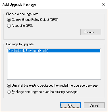 Note: Normally, when upgrading DeviceLock Service, the new MSI package detects the package to update in the GPO so the actions in Step 7 and Step 8 are performed automatically. |