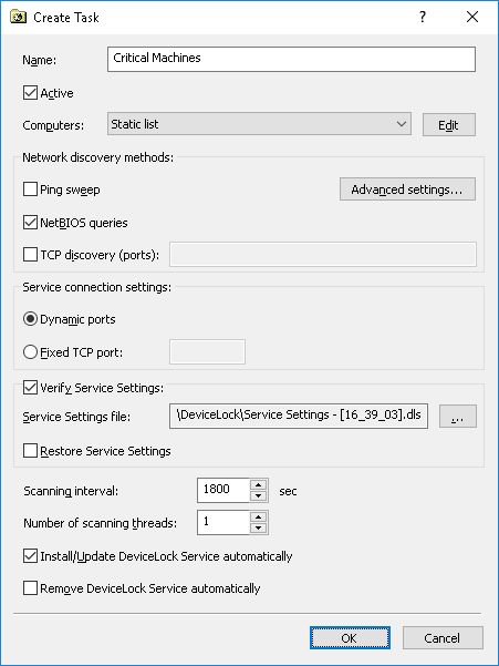 To configure the task to install DeviceLock Service, select the Install/Update DeviceLock Service automatically check box in the Create Task dialog box, and make sure that the Active check box is selected.