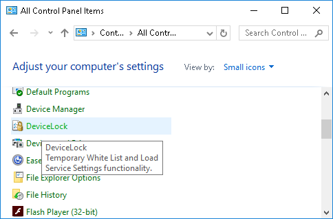 Note: •To access the DeviceLock applet, the user has to switch Control Panel to the “Small icons” view mode. •The caption of the applet window displays the DeviceLock version and build number. •The DeviceLock applet may fail to start, returning the “Certificate is not installed” error. To resolve this issue, install the public key of the DeviceLock certificate on the client computer. For installation instructions, see