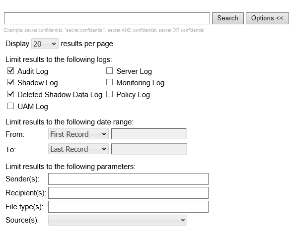 This area is located at the top of the search results page. Click Options to view all the search parameters that were used during the search: