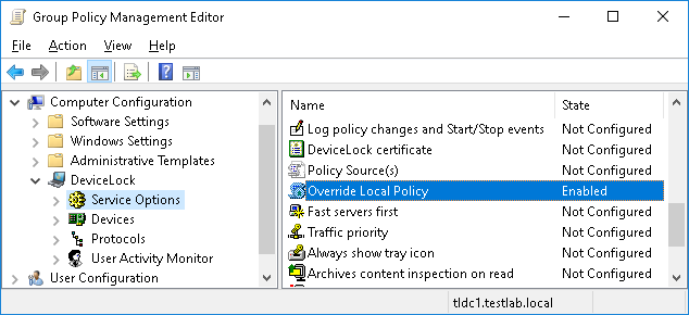 If Override Local Policy is enabled, the Use Group/Server Policy parameter in Service Options in the DeviceLock Management Console or DeviceLock Enterprise Manager cannot be disabled.
