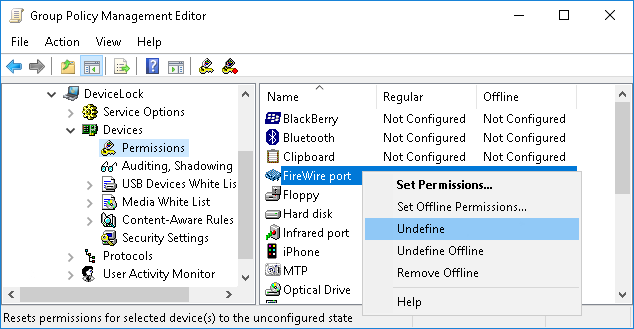 Use Undefine entire policy from the shortcut menu of DeviceLock to reset all parameters to the unconfigured state. A message that asks you to confirm the operation will appear: “Undefining the entire DeviceLock policy is an irreversible action. All DeviceLock settings will be lost. Are you sure you want to continue?”