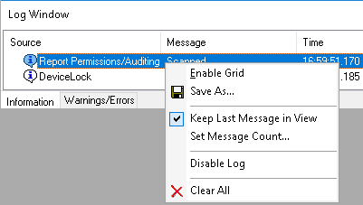 There is a log window at the bottom of the main window. The log window is used to display useful information about ongoing activity as well as diagnostic and error messages. There are two log lists: Information and Warnings/Errors.