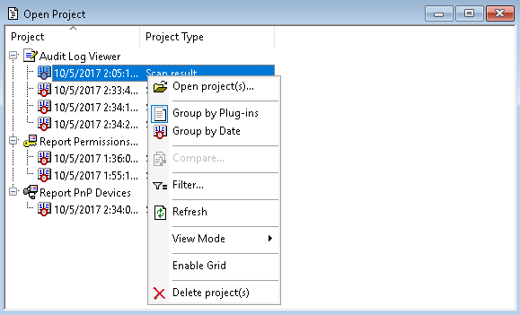 You can group saved projects by the date when they were scanned and by the type of information they contain. Select Group by Plug-ins or Group by Date from the shortcut menu or click appropriate buttons on the Project toolbar.
