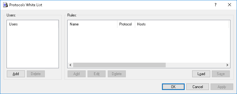 To delete a user or group, in the left pane of the Protocols White List dialog box, under Users, select the user or group, and then click Delete.