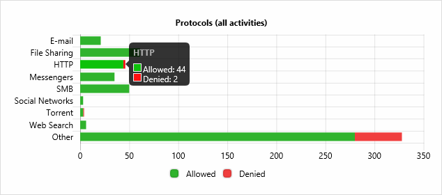 The bar is divided into two segments: the green segment represents allowed actions while the red one stands for denied actions. The length of the green segment indicates the number of allowed actions; the length of the entire bar indicates the total number of actions, both allowed and denied. To view numeric readings, hover over a bar. A pop-up window will appear that indicates the device type or protocol corresponding to the selected bar, and also displays the numbers of user actions that were allowed or denied for this device type or protocol within the reporting period.