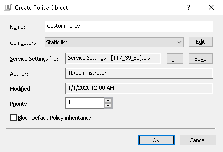 •Block Default Policy inheritance - Disable the Default Policy for all computers assigned to the policy object. Select the Block Default Policy inheritance check box to disable the Default Policy. Clear the Block Default Policy inheritance check box to enable the Default Policy.