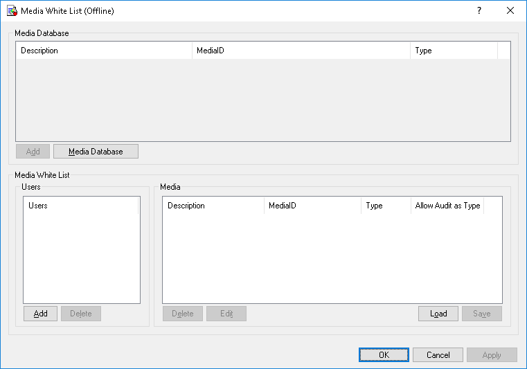 4. In the upper pane of the Media White List (Offline) dialog box, under Media Database, click Media Database.