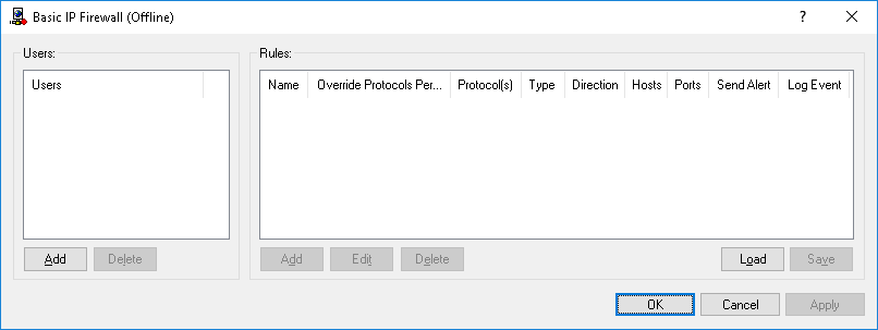 The users and groups that you added are displayed under Users in the left pane of the Basic IP Firewall (Offline) dialog box.