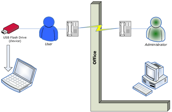 The DeviceLock Temporary White List function enables the granting of temporary access to USB devices when there is no network connection. Administrators provide users with special access codes over the phone that temporarily unlock access to requested devices. The following diagram illustrates the process of granting temporary access to USB devices.