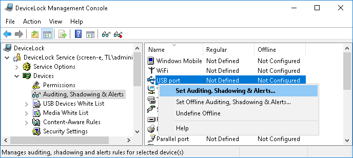 1. Select the USB port record from the list of device types under Auditing, Shadowing & Alerts, and then select Set Auditing, Shadowing & Alerts from the shortcut menu available by a right mouse click.