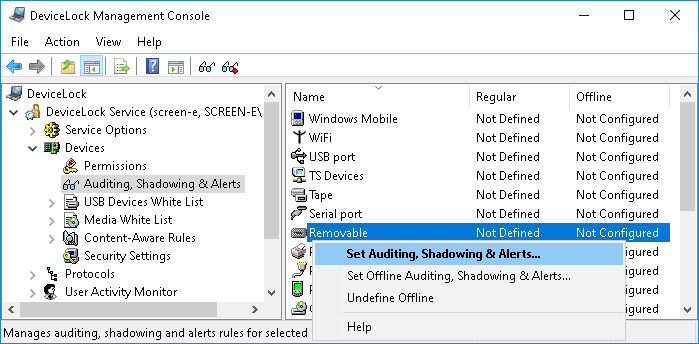 1. Select the Removable record from the list of device types under Auditing, Shadowing & Alerts, and then select Set Auditing, Shadowing & Alerts from the shortcut menu available by a right mouse click.