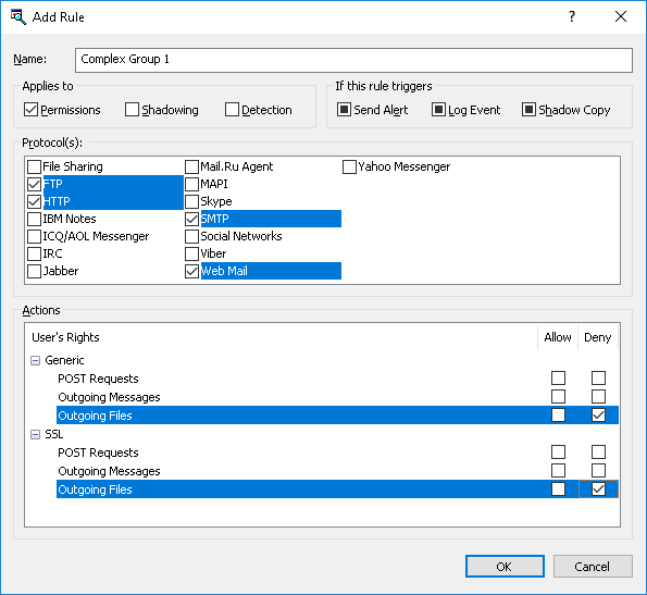 c) Under Action(s), select the Deny check box next to Generic: Outgoing Files and SSL: Outgoing Files.