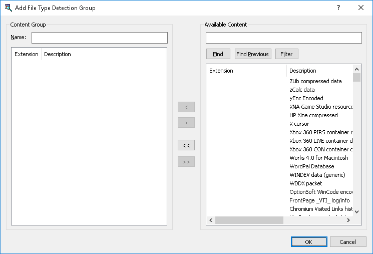Note: It is possible to search the available content database for specific file types by extension or description. Wildcards such as asterisks (*) and question marks (?) can be used to search for a specific group of file types. To find a specific file type or specific group of file types, under Available Content, type an extension or description with or without wildcards in the search string, and then click Find. To filter file types, click Filter. To remove the filter, apply it to an empty string. An asterisk (*) replaces an unlimited number of characters. The question mark (?) replaces a single positional character. Wildcards can be used in any position and in any quantity. |