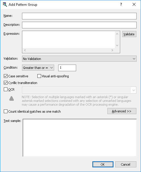 •Cyrillic transliteration - When this check box is selected, the group recognizes Cyrillic text to be detected regardless of whether the text is written in Cyrillic or Latin letters. For example, if the Russian word Серия matches the group, then the word Seriya will match it as well.