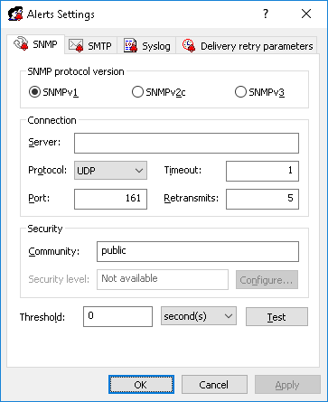 Use the SNMP tab in the Alerts Settings dialog box to configure DeviceLock Service for SNMP support.