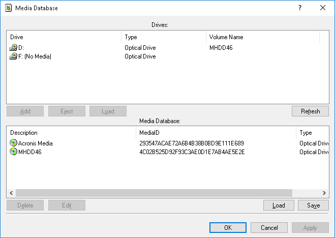 You can add media to this list by selecting the desired record in the Drives list and clicking Add. It takes some time (depending on the media size) to authorize the media. If the media is already in the database, it cannot be added there a second time.