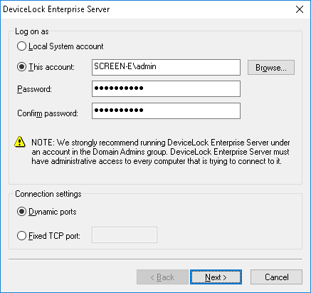 If you’re installing DeviceLock Enterprise Server in the domain environment, we recommend that you use a user account that is a member of the Domain Admins group. Since Domain Admins is a member of the local group Administrators on every computer in the domain, members of Domain Admins will have full access to DeviceLock Service on every computer.