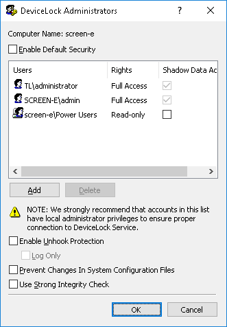 Users with local administrator privileges (i.e. members of the local Administrators group) can connect to DeviceLock Service using a management console and change permissions, auditing and other parameters. Moreover, such users can uninstall DeviceLock from their computers, disable or delete DeviceLock Service, modify a service’s registry keys, delete a service’s executable file, and so on. In other words, users with local administrator privileges can circumvent the default security based on Windows ACL.