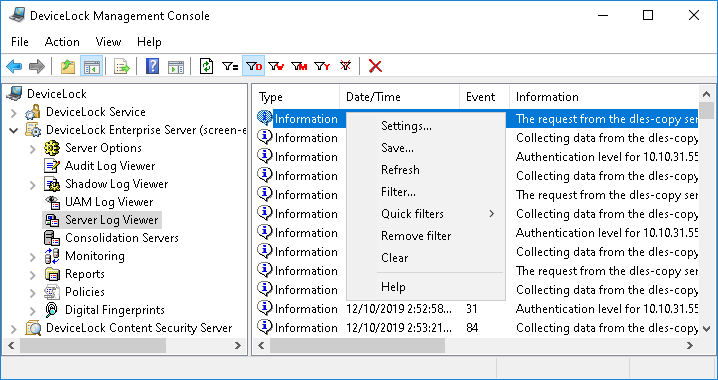 This viewer allows you to retrieve the internal DeviceLock Enterprise Server’s log. The server uses this log to write errors, warnings and other important information (such as configuration changes, start/stop events, version, and so on).