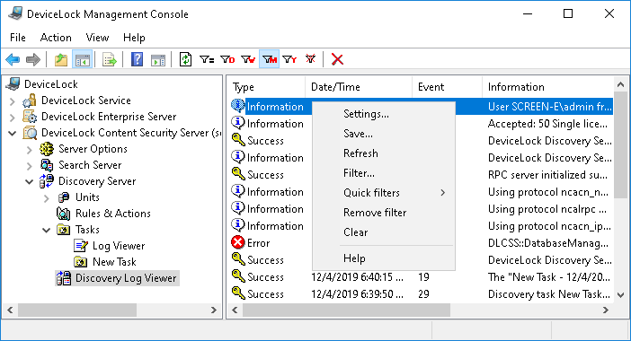 This viewer allows you to retrieve DeviceLock Discovery Server’s internal log. The server uses this log to record errors, warnings and other important information (such as configuration changes, start/stop events, and so on). Unlike the Tasks Log, the Discovery Log contains information that has no direct relation to scanning tasks.