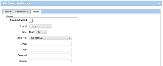 Use this dialog box to create a storage for backing up files from a CIFS share. Specify the name and the cloud location for the storage, the Local Cloud Hub that will perform backups, the source share address, and the data retention policy. In addition to backups, which can be regularly scheduled or initiated manually, you can set up periodic restores to a different CIFS share.