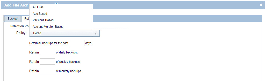 The Retention Policy tab enables you to set a retention policy for your backups. The following policies are available: