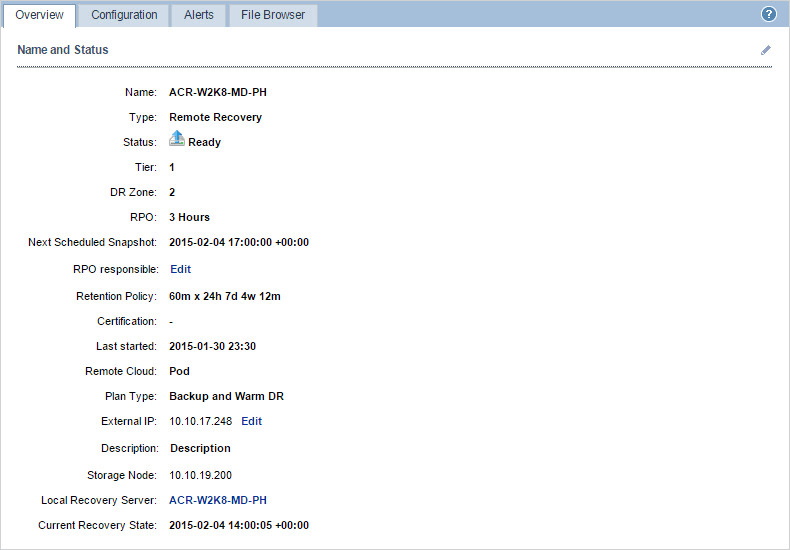 The contents of the Overview tab vary by server type. The following is the tab example for a remote recovery server: