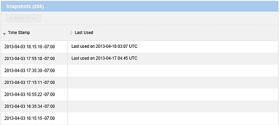 The Snapshots pane is available for Local Recovery, Remote Recovery, and Archived servers. The pane presents the snapshot history for the server. Last Used is the date the snapshot was last activated.