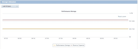 - A graph of the change in aggregate Performance Storage data and Reserve Capacity over time. Storage volume is expressed in terabytes (TB). Performance Storage data is represented by a yellow line. Reserve Capacity data is represented by a reddish brown line.