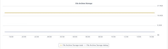 - A graph of the change in File Archive Storage data over time. Storage volume is expressed in terabytes (TB). File Archive Storage data is represented by a yellow line, Deduplicated data is represented by a blue line.