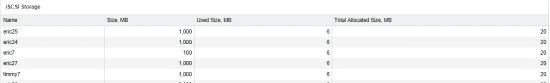 - A table of data about iSCSI storage: allocated and used space for each storage.