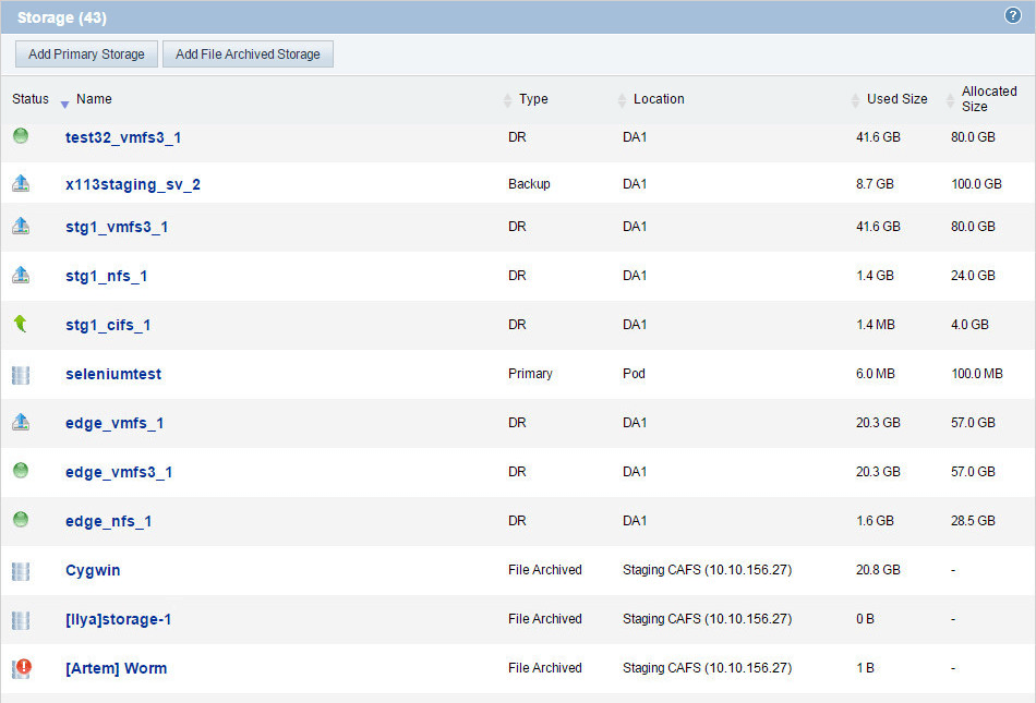 A table of the storages matching the selected filters. Storage of the File Archived type holds backups of a client's CIFS share. Storage of the DR or Backup type is a mirror of a client's NetApp volume.