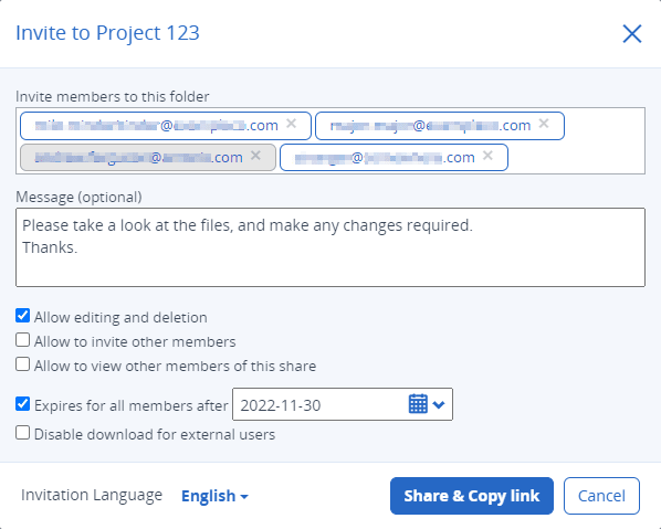 The folder share link is copied to your clipboard, and the members you invited will each receive an email with instructions on how to access the share link.