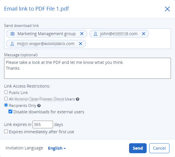 We recommend using the Message field to provide information about the type of share, the expiry date, and if the link is a single use download link, as this information is not included in the notification email. -