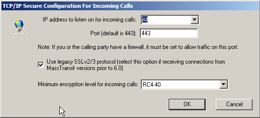 The TCP/IP Secure Configuration For Incoming Calls window appears. Select the IP address you want MassTransit to listen on from the IP Address to listen on for incoming calls drop-down menu. Selecting All means that MassTransit will be listening for incoming calls on all network interfaces. That is the default option. If you select a particular IP address, MassTransit will use only that address to listen on.