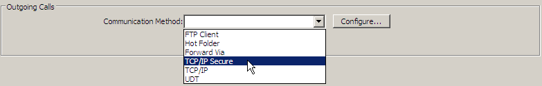 In the Outgoing Calls tab of the Setup window, select the TCP/IP Secure option from the Communication method drop-down menu.