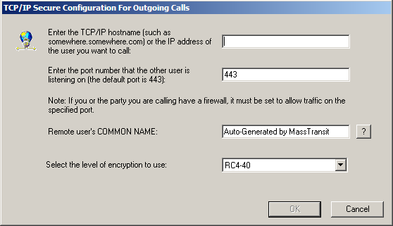 In the Remote user's COMMON NAME field, enter the common name of the contact. The "Common name" is usually provided to you by the remote user and is a component of his SSL certificate. The default common name (which is "Auto-Generated by MassTransit") should be used only if the remote user is using a certificate that is automatically generated by MassTransit. Leaving this field blank will set the default option.