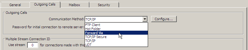 The Forward Via configuration of outgoing calls is set per contact. You need to do it for every contact that will be using the Forward Via communication method.
