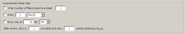 MassTransit allows you to configure trigger conditions for placing automatic calls to a particular contact. The automatic calls can be triggered at a set period of time or number of files to send.