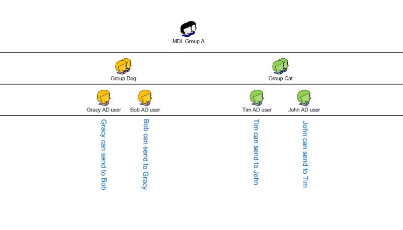 In the first example, the MassTransit Distribution List – “MDL Group A” contains two AD groups – “Group Dog” and “Group Cat”. Each of the two groups has two members. The members of “Group Dog” can send files only to each other. The same is valid for the members of “Group Cat”.