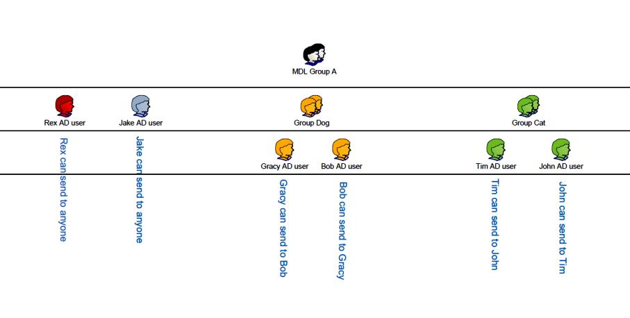 In the second example, the MassTransit Distribution List – “MDL Group A” contains two AD groups – “Group Dog” and “Group Cat” and two AD users – “Jake AD user” and “Rex AD user”. These users can send files to each other, as well as to all users that are on child tree levels – the members of “Group Dog” and “Group Cat”. The members of “Group Dog” can send files only to each other. The same is valid for the members of “Group Cat”.