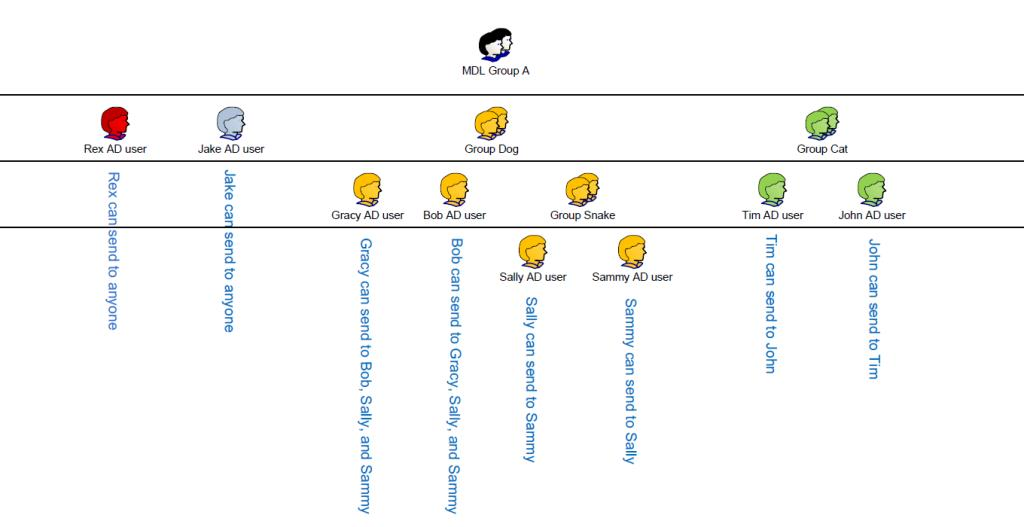 In the third example, there is one additional AD group – “Group Snake” which belongs to “Group Dog”. “Sammy AD user” and “Sally AD user” are on the lowest tree level of the MDL, so they can send files only to each other. In contrast to the previous example, users from “Group Dog” can send files not only to each other but to members of “Group Snake” as well, since it is also a member of “Group Dog”. “Rex AD user” and “Jake AD user” can send to all users.