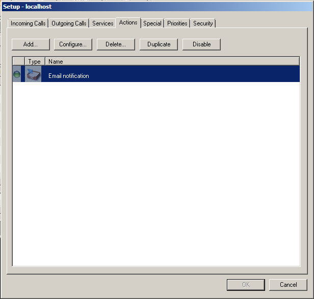When you have configured the action, click on the OK button in the Add Actions window. The action should appear in the list of the Setup window.