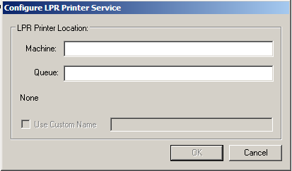 The Configure LPR Printer Service window appears next. In the Machine field, enter the name or the IP address of the printer.