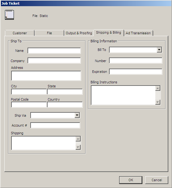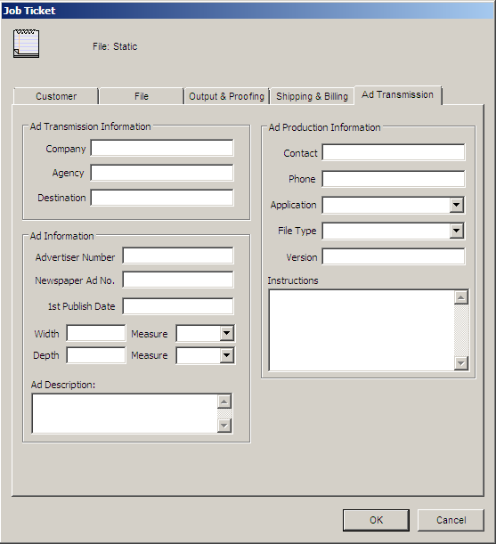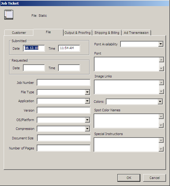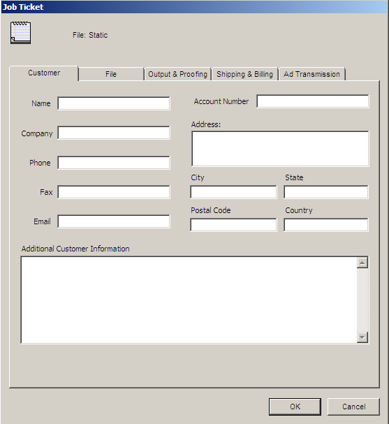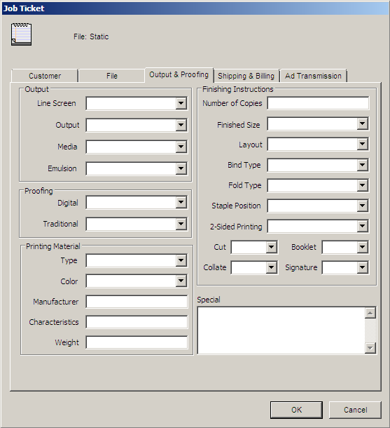 The Job Ticket window appears. Fill in the desired fields in the available tabs: