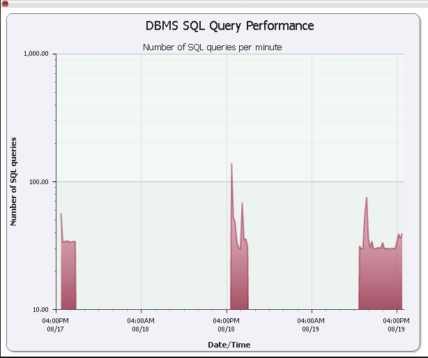 General analysis – DBMS type, version, etc.; if you click on the chart icon in the bottom right corner, a "DBMS SQL Query Performance" graph will be displayed showing the number of SQL queries per minute (to close the graph, click the red x in the top left corner):
